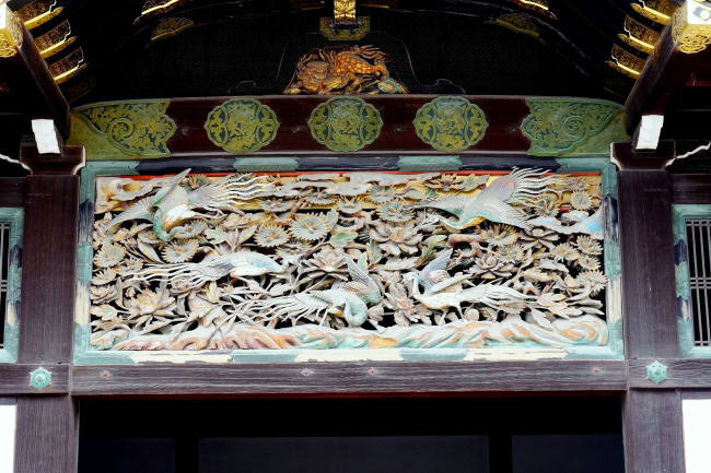 | 唐門 二の丸御殿の正門にあたり、唐破風造りの四脚門形式で建てられています。平成23年(2011年)から始まった修復工事の一環で昨年修復が完了したばかりですので、施された彫刻や飾り金具が往時の輝きを取り戻しています。 門には天皇家の菊花紋(十六八重表菊)がありますが、修復の際この門の下に徳川家の家紋である葵紋があったことがわかり、時代の移り変わりの名残と推測されています。 右の写真は二の丸御殿内から撮影 |
