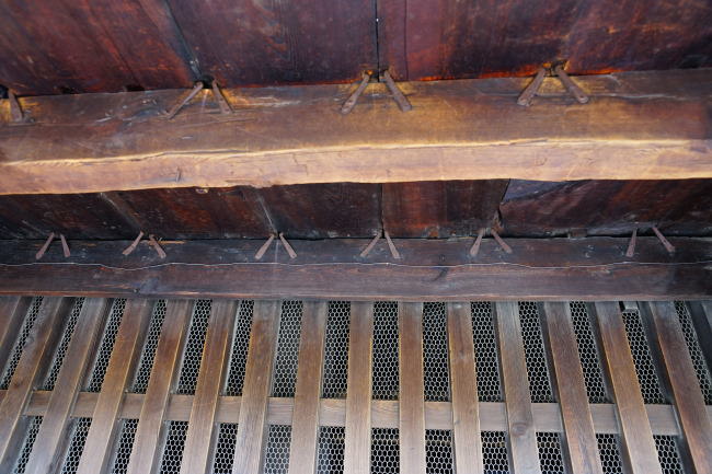 鴬張りとは人が床の板の上を歩く事によりきしみ音が鳴る様につくられた仕組みをいい、日本古来の建築技法で、外部侵入者の危険探知の為に設けられたとされています。 詳しくはWikipediaの「鴬張り」で。 |