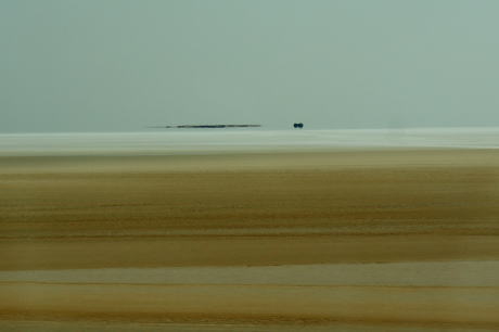 大塩湖ショット・エル・ジェリド トズールからドゥーズに向かう途中にあるのがこの大塩湖です。その面積なんと5000平方kmとか。日本の琵琶湖の7倍以上、トルコで見たトウズ湖の3倍以上の大きさです。3月半ばのこの時期はまだそんなに暑くもないので水が残っているのが見えます。 上左の写真はバスの中から撮った蜃気楼の写真です。上右の写真は大塩湖の中央を通る道路で、真直ぐな道が延々と続きます。 |