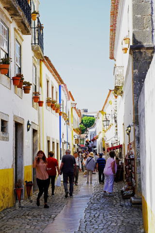 | エヴォラから約2時間半、『谷間の真珠』とも呼ばれる城壁に囲まれた人口約1万人ほどの小さな街オビドス(Óbidos)に到着です。 ここオビドスは、石器時代からの歴史があり、小高い丘の上に8世紀にムーア人が築いた要塞を、レコンキスタ後にデニス王が、王妃イザベルにプレゼントしたことから、共和制が施行される19世紀まで代々ポルトガル王妃の直轄地となり、別名「王妃の村」と呼ばれていました。 |