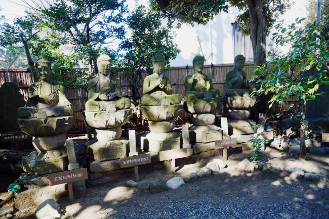 五智如来とは、釈迦如来、阿弥陀如来、大日如来、阿閦如来、宝生如来のことをいい、五大如来ともいって、密教で5つの知恵(法界体性智、大円鏡智、平等性智、妙観察智、成所作智)を5体の如来にあてはめたもので、当初はこの如来像を本尊として西行寺を創るのが目的であったと伝えられています。 |