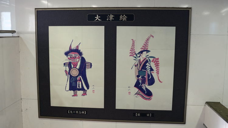 大津絵とは、江戸時代から続く民族絵画ということで、東海道を旅する人たちの護符として知られていたとのことです。下の写真は大津駅で撮影したものですが、左の絵は「鬼の寒念仏」、右の絵は「藤娘」とのことです。