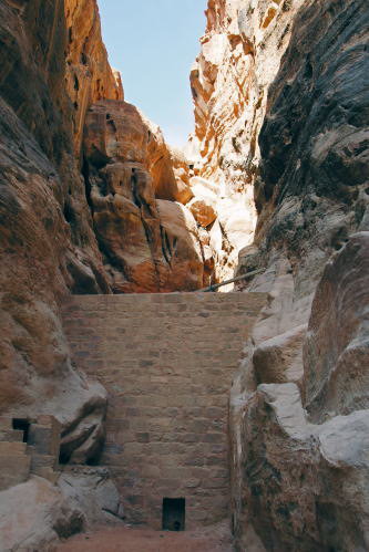 | シーク シークとは自然にできた岩の裂け目のことで、約1.5kmもの間50〜100mもの高さがある岩の間を歩きます。この道以外には遺跡の中央部には行けませんので、すごい場所を探したものだと感心せざるを得ません。 写真は左からシークの入り口、中央が絶壁状態のシーク、右がシーク出口でエル・ハズネが見えます。 |