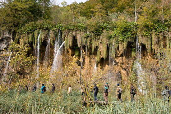 | プリトヴィッツェ湖群国立公園 プリトヴィッツェ湖群国立公園はクロアチアの国立公園の中で最大(約192平方km)で、大小16の湖と92ヶ所の滝を形成する美しい景観をかもし出しています。エメラルドグリーンの色をした16の湖は山間から流れ出てくる水が森の中を標高636mから503mまで、およそ8kmにわたって滝によってつながれており、中でも落差78mのヴェリキ・スラップは見ごたえがあります。 ここプリトヴィッツェ湖群は19世紀の終わりごろから観光地化したとのことで、1949年当時のユーゴスラビア政府が国有化して国立公園としたもので、1979年に「プリトヴィッツェ湖群国立公園」としてユネスコの世界自然遺産に登録されたものの、独立時の紛争により大きな被害を受け一時期は危機遺産として指定されましたが現在は解除されています。 午前9時観光スタートです。まずは最大の滝であるヴェリキ・スラップを見ることになり、バスで移動し、その後トレイルと呼ばれる木道を通って湖と滝を観光します。 |