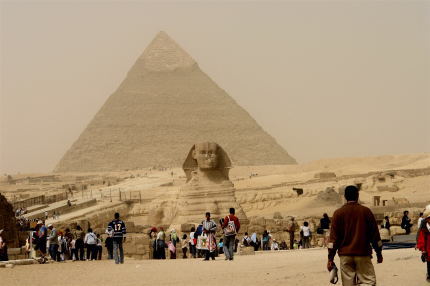 | ピラミッドとスフィンクス エジプトといえば、ピラミッドにスフィンクス、ツアーの最大の観光目的です。今から5000年前、紀元前3000年頃からの歴史を持つエジプト王朝の王の墓としてサッカーラに階段ピラミッドが造営されてから、キザにクフ王、カフラー王がピラミッドとスフィンクスを造営するなど数多くのピラミッドがエジプト国内の各地で造営されたようです。 生憎と気温も高く、風も吹いて若干砂嵐が発生してるようでギザ、ダフシュールでの写真は残念なものとなりました。 |