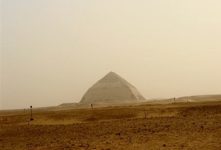 | 屈折ピラミッド(上)と赤のピラミッド(下) ダフシュールにあるスネフェル王(クフ王の父)のものとされているそうですが、ピラミッドの周りは砂漠のど真ん中といった感じです。 屈折ピラミッドの高さは105m、真ん中辺りで傾斜が変わっており、何のために変えたのか判っておらず、計画変更とも王の死期が近づいたので完成を急いだのではといわれているようです。 赤のピラミッドは使用されている石が赤っぽいのでこう呼ばれているようですが、高さは104mあり、断面が2等辺三角形の真正ピラミッドとしては一番古いものです。 いずれも砂嵐の影響であまり良い写真ではありません。 |