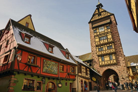 | リクヴィール オベルネからバスで約50分、アルザスワイン街道の中ほどにある村リクヴィール(リクヴィルとも呼ばれています。)に着きます。「ぶどう畑の真珠」とも称されるリクヴィールは人口1200人足らずの小さな村で、13世紀の半ばに神聖ローマ皇帝ルドルフ1世により城が建設され今でもその城壁が残っており村はその城壁に囲まれています。第2次世界大戦の戦火を免れた村は中世のたたずまいを残していて「フランスの最も美しい村」に認定されています。 |