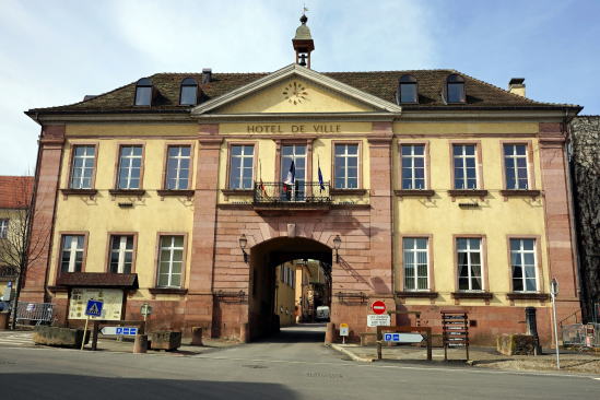 市庁舎 城壁囲まれた村はこの市庁舎の中央の門からはじまります。 村なのに建物には「HOTEL DE VILLE」、日本語にすると「市庁舎」となっています。 |