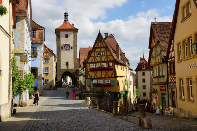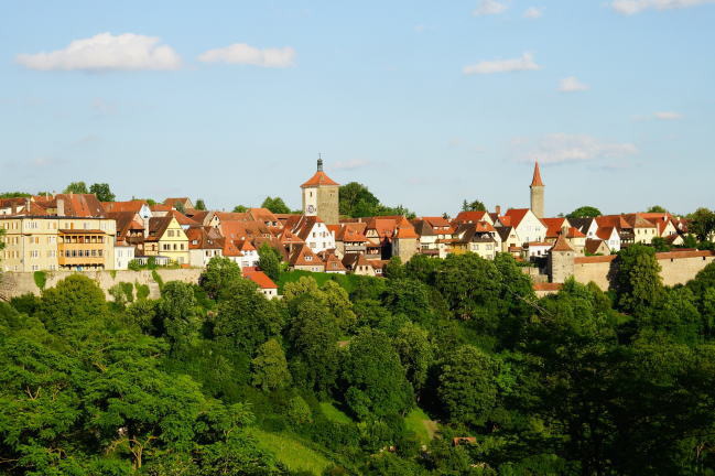 | ローテンブルク 古城街道とロマンティック街道が交わるところに位置して、「中世の宝石箱」と呼ばれているローテンブルク、正式名称はローテンブルク・オプ・デア・タウバーという長い名前の町で、「タウバー川の上にあるローテンブルク」という意味のようで、ドイツ南部のタウバー川を望む丘の上にある古い町です。 街の起こりは970年にフランケン地方の貴族がoberhalb der Tauberという城を建てたのが始まりで、1274年にハプスブルク家より市として認められたころより町の要塞化が行われました。 旧市街はわずか42㎢で周囲を城壁に囲まれていますが、第2次世界大戦時の1945年3月にアメリカ空軍機の爆撃(攻撃目標は他の町でしたが霧のため目標を見誤っての誤爆といわれています。)により町の東側部分が破壊されており、戦後世界各地からの寄付によって戦前時の姿を取り戻しており、ノンビリ町歩きのできるところです。 |