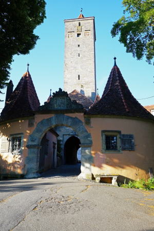 | コーボルツェラー門(Kobolzeller Tor) コボルツェラー門とも呼ばれている門は、タウバー渓谷に面したところにあり下からの敵を防御するために1360年に造られたものです。 旧市街から門を抜けるとYの字になっており、右はタウバー渓谷に行く下り坂の道、左は市壁となります。 |