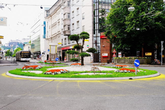 ロータリーの奥に見える自動車は、市内の交通として活躍しているトロリーバスです。ザルツブルクもかつては路面電車(トラム)が走っていましたが、1953年に全廃されて、普通のバスとこのトロリーバスだけとなっています。 |