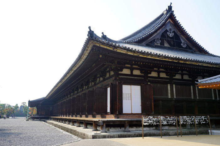 | 本堂 創建時の本堂は元和5(1616)年に発生した火災で焼失し、現在の本堂は、元和7(1621)年に徳川2代将軍徳川秀忠の正室崇源院(江[ごう] 淀殿の妹)の願により破却された伏見城の遺構を移築して再建されたものです。 本堂内の廊下の天井は、関ヶ原の戦いの前哨戦であった伏見城の戦いで自刃した、鳥居元忠らの武将たちの血の跡の残る廊下の板を供養のために天井板としたもので、「血天井」として知られています。 |