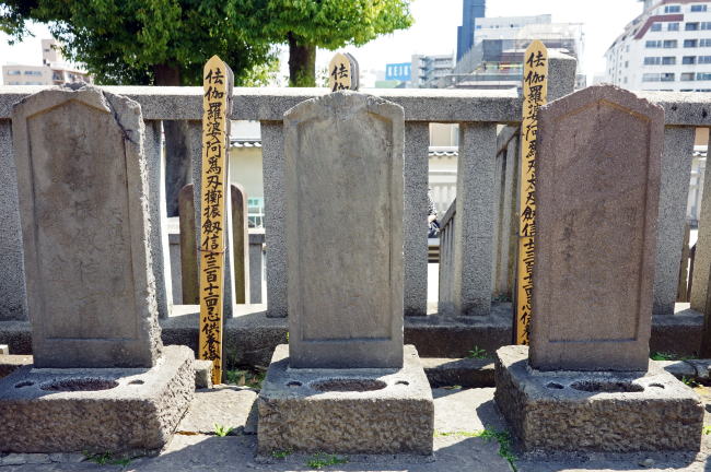 左から富森助右衛門正因(江戸詰馬廻兼使番)、近松勘六行重(馬廻役)、堀部彌兵衛金丸(前江戸留守居役)の墓 | ||||||||||||||