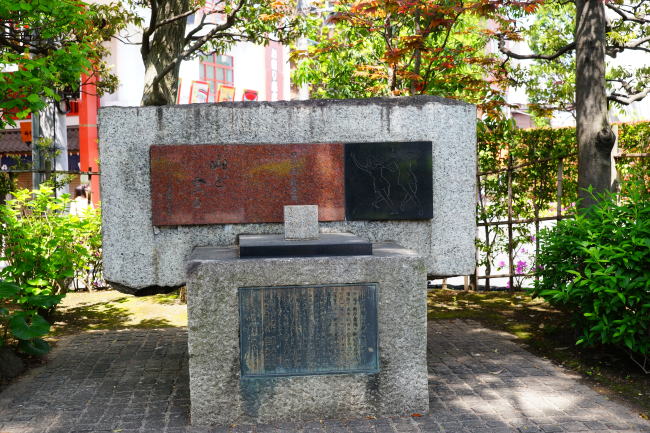 喜劇人の碑 奥山に建てられたこの石碑は、浅草をはじめとして国内各地で、人々に笑いと喜びを与えてくれた喜劇人たちに感謝の意を表すために、昭和57(1982)年設けられたもので、森繁久彌による題字が刻まれています。 碑の裏面には川田晴久、古河ロッパ、堺駿二、柳家金語楼、伴淳三郎、渥美清、森繁久彌など数十人の喜劇人の名が刻まれています。 |