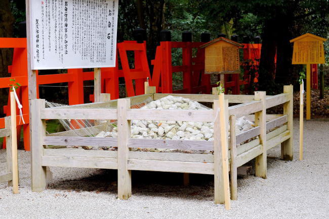 お白石 南口鳥居の横に積まれたこの石は、「お白石(おしらいし)」とよばれるもので、本殿の御垣内に敷き詰めるための石で、かつては参拝者が鴨川から石を持ち寄ってお清めをしたのちに御垣内に敷き詰めてご奉仕していました。 明治時代に入ってから新政府が発した上知令(江戸時代に認められていた寺社領の没収)により遷宮ごとに石を採取することができなくなったため、「石拾い神事」として敷き詰められた石を取り出し、3年間お清めをしたのちに遷宮の時に戻すこととなったようです。 神社では21年ごとに遷宮を行っていますが、この時に御祓いをすませた白石を元に戻す「お白石持ち神事」が行っており、訪れたこの年は遷宮の年とのことで参加者を募っていました。(参加料は500円ですが、本殿前の仮置き場に納めるだけで御垣内には入れないとのこと。) |