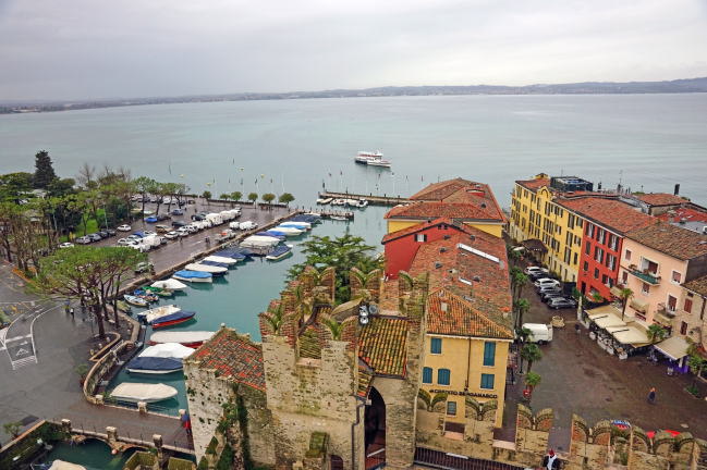 | シルミオーネ 雨の降り続く中午前7時55分バスはシルミオーネに向けて出発です。 シルミオーネはヴェローナからバスで約40分西のところにあり、イタリアで最も面積の広いガルダ湖南端に細く突き出した半島(半島の長さは約4㎞ほど)にあります。古代ローマ時代の最初の温泉であったとされており紀元前1世紀には景勝の休暇地、今でいうリゾート地として利用されていたようです。70度近い源泉があることから19世紀には「テルメ」として利用されているようで関節炎、喉頭炎、気管支炎、外傷の後遺症に効果があるとされています。 スカラ家の城(スカリジェロ城) シルミオーネ旧市街の入り口にあたるところにあるこのお城は13世紀に建てられたといわれ、周囲をガルダ湖の水を取り入れた濠で囲まれています。晴れていればきれいな色で撮れているのでしょうけどちょっと残念です。 |