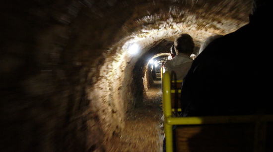 | トロッコ列車 2人乗りのトロッコが0両ほど(或いはもっとあったかもしれません。)つながって鍾乳洞の中を結構速いスピードで走り抜けます。途中頭がぶつかるのではと思うくらい天井の低いところもありますが全くスピードを落とさずに走って行きます。 トロッコを降りると観光客はガイドの案内で徒歩観光することになりますがあいにくと日本語ガイドはないので英語のガイドについてゆくことになります。 |