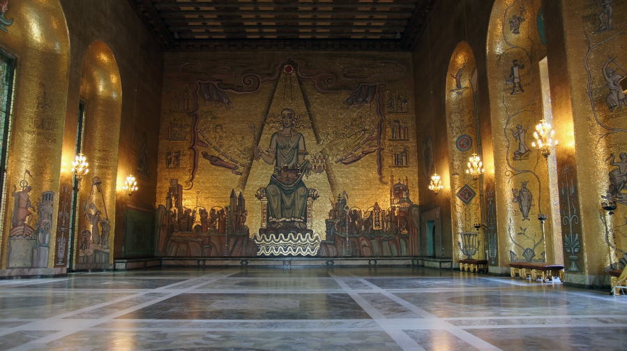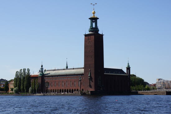 | ストックホルム市庁舎 リッダー湾沿いに高さ106mの塔を備えて建つレンガ造りのこの建物。ストックホルムのシンボルとして市民に利用されていますが、この建物を有名にしているのが市庁舎の中で毎年開催されるノーベル賞受賞式後の晩餐会です。 |