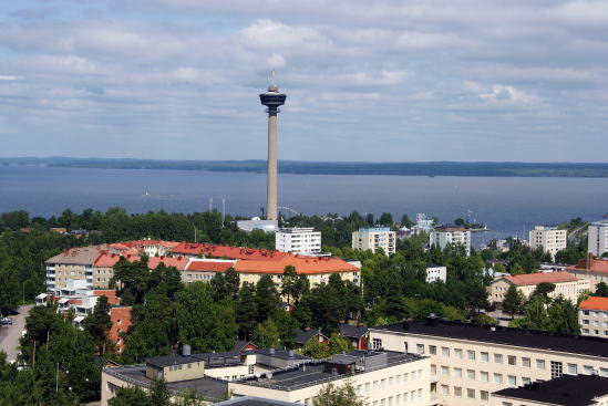 ビューニッキ展望台 町の中心から2km位離れたタンペレの丘にビューニッキ公園があり、ここにある展望台ですが、高さはせいぜい30m位。 但し、エレベータはついてなく狭い螺旋階段を昇らなければなりません。丘の上にあるため街全体360度見渡すことが出来ます。 |