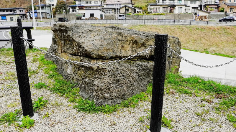 | 津波石 明治三陸地震でこの地点まで打ち上げられたと地元に人たちに伝わる石で、推定重量は約20トンという巨大な石です。石には「オルビトリナ」と呼ばれる1億年以上も昔に浅海に生息していた有孔虫の化石が含まれており、地震の際の津波によって海岸から400m離れ標高28mあるこの場所まで移動したことが、専門家の調査により判明しています。 |
