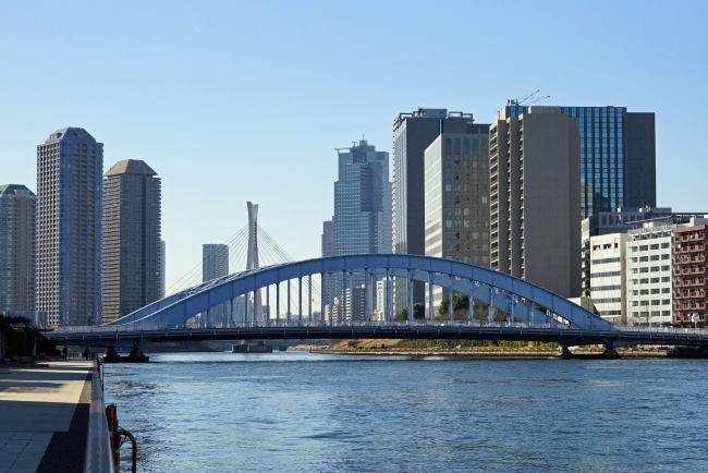 | 永代橋 隅田川に架けられた橋の中では四番目に古い元禄11年(1698年)に五代将軍徳川綱吉の50歳を祝して架けられたとい古い歴史があり、「永代」の名は当時この地が「永代島」と呼ばれていたからとか、徳川幕府が末永く続くようにとの願いを込めた意味もあるようです。当時は現在の橋より100mほど上流に架けられていたようです。元禄15年(1702年)12月15日の赤穂浪士の吉良邸討ち入りでは、討ち入り後に浪士たちがこの橋を渡って泉岳寺まで向かったとのことであり、また、文化4年(1807年)8月には深川八幡の祭礼時につめかけた群集の重みに耐え切れず橋が落下、江戸市民1400人が亡くなるという史上最悪の落橋事故がおきています。 現在の橋は関東大震災後の大正15年に復興事業の第一号として架けられたもので「帝都東京の門」といわれていたとのことで、2007年に国の重要文化財に指定されています。) |