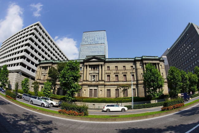 | 日本銀行本店 常盤橋交差点付近は江戸時代に金貨鋳造所の「金座」がおかれていたところで、文禄4年(1595年)徳川家康が後藤庄三郎光次(彫金師)を江戸に招いて小判鋳造を始めたのが金座の始まりで、明治2年までこの地で鋳造が行われていました。 この本店の建物は明治29年(1896年)ベルギーの国立銀行を参考にして建てられたもので、東京の建築遺産50選に指定されており、国の重要文化財となっています。 (魚眼レンズで撮影) |