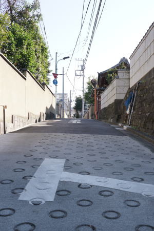 綱坂を上りきるとT字路となります。右に曲がると三田1丁目の交差点に、左に曲がると二の橋の交差点に出ますが、ここにある坂が「綱の手引き坂」です。