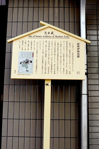 赤穂浪士の一人である前原伊助(宗房)は、赤穂藩時代に金奉行を努めていたこともあって商才に長けていたことから、江戸゛に出てからは単独行動をとって吉良邸の裏門近くであったこの地で、米谷五兵衛と称して店を営み、吉良家の動向を探り、討ち入りの際には大石主税とともに裏門隊に属していました。
