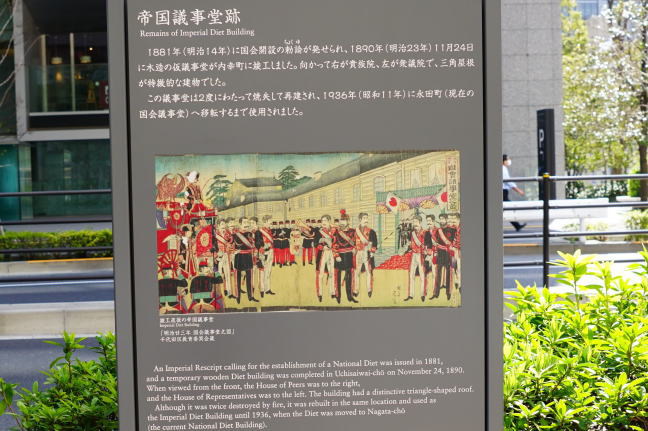 帝国議事堂跡の説明板 経済産業省がある都道ところの301号線の歩道上に設けられているこの説明板のある場所は、わが国で最初となる仮の国会議事堂が明治23年(1890年)に設けられていたところで、当時は木造建築で建てられました。 議事堂は翌年第1回の帝国議会が開催されている期間中に漏電で焼失し、一時期華族会館(旧鹿鳴館)や帝国ホテルで議会を継続、その後この地に再建されていますが、関東大震災跡の大正14年(1925年)に改修中に作業員の火の不始末から火災を発生し、3か月間の突貫工事で再建されています。 (所在地:千代田区霞が関3-8) |