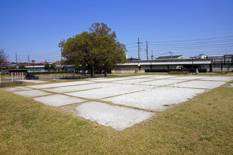 | 幢竿(どうかん)跡 幢竿とはあまり聞かない言葉ですが、調べると旗竿を建てる支柱で、境内にはいくつもの幢竿跡があります。 何ヶ所かある幢竿跡のうちなぜかここだけは斜めに設けられています。その角度も地表から54度と傾斜しており、直径30cm程の木材を地中1.2mほど埋め込んでいたようですが、なぜこのように斜めに置かれたのか理由は判っていないようです。 |