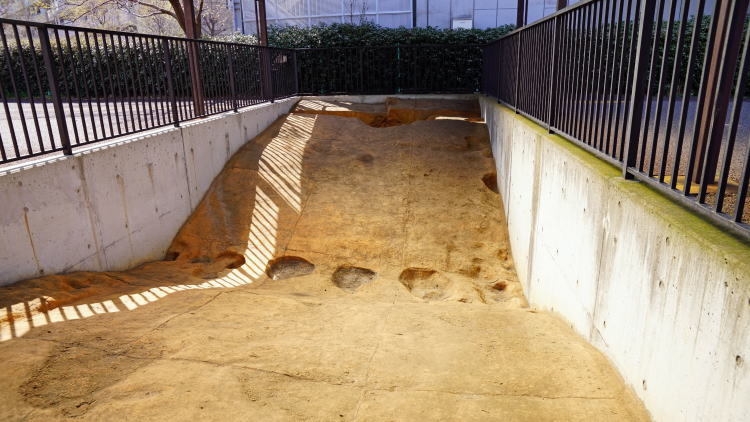 | 東山道(とうざんどう)武蔵路遺構再生展示施設 東山道は、都(みやこ = この時代の都は平城京のある奈良でした。)と国府を結ぶ古代の交通路の一つで、武蔵路(むさしみち)は現在の群馬県である上野国(こうずけのくに)国府から、南下して武蔵国府に至る往還路でした。発掘調査で幅12m設けられていたことがわかっています。 (所在地:国分寺市泉町2-10) |