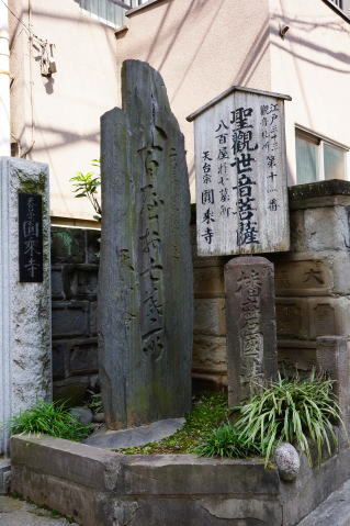 駒込土物店跡の石碑 本郷通りの浅嘉交番のそばにあるこの碑は、江戸時代に神田、千住とともに三大市場のひとつであった市場がおかれていたところで、元和年間(1615~162年)に近郊の農民が野菜を売りに出かけてきてこのあたりで休むことが多かったようで、ここに付近の住民が買い求めにやってきたのが市の起こりとされていて、「駒込のやっちゃ場」と呼ばれていました。 この近辺は駒込茄子の生産地でもあり、大根、人参、牛蒡などの土物も売られていたことから「土物店」といわれましたが、正式名称は「駒込青物市場」といい、昭和12年(1937年)に豊島区の巣鴨に豊島青果市場として移転するまで続いていました。(所在 文京区本駒込1-6-16) |