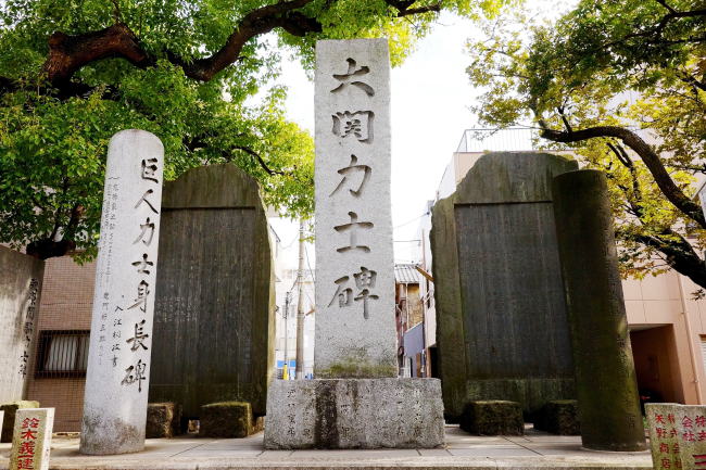大関力士碑 富岡八幡宮は江戸勧進相撲発祥の地として知られており、当時境内で本場所も開催されていました。この大関力士碑は歴代の大関力士を顕彰するもので、現存する最古の番付表である宝暦7年(1757年)10月のものに大関として記載されている雪見山堅太夫を初代として琴欧州勝紀まで看板大関と横綱に昇進した力士を除く114人の名が刻まれています。 因みに看板大関とは江戸時代大関不在時に見栄えが良い力士を番付に大関として載せ実際には土俵に上がらなかった大関のことです。 大関力士碑の左側には「巨人力士身長碑」があり、江戸時代からの長身力士の名が刻まれています。最高身長は生月鯨太左右エ門で7尺6寸八分(2m30cm)あったといい、我々が知っている長身大関琴欧州の2m3㎝よりも27cmも大きいとのこと。 |