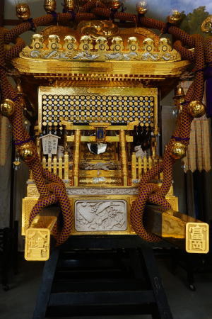 日本一の神輿 富岡八幡宮の祭りは深川八幡祭深川祭とも呼ばれていて毎年8月15日に例大祭が行われ、赤坂の日枝神社の山王祭、神田明神の神田祭とともに「江戸三大祭」の一つに数えられています。 3年に一度の本祭りでは大小120もの神輿が繰り出され、沿道の観衆からお清めの水が浴びせられる「水かけ祭り」と呼ばれています。 左の神輿は重さ何と4.5t、右の神輿は約2tあるそうです。(神輿蔵のガラス越しに撮影) |