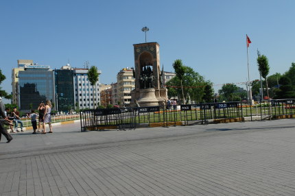 | タクシム広場 新市街でもつともにぎやかなところで待ち合わせのスポットになっているとか。右の写真はタクシム広場の記念碑で、トルコの初代大統領であるムスタファ・ケマル・アタテュルクとその同志達の記念碑です。 |