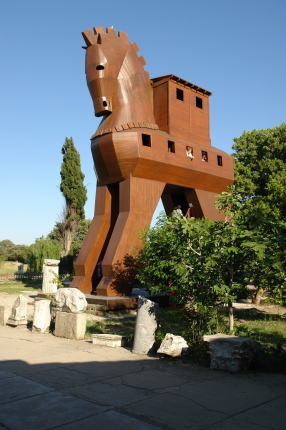 | トロイの木馬 ブラッド・ピット主演の映画でおなじみのトロイ戦争のトロイ陥落のシーンに出てくる木馬ですが、これは学生達が作ったレプリカです。映画で使用された木馬は寄付されてトロイの街中に飾ってあるとか。 |