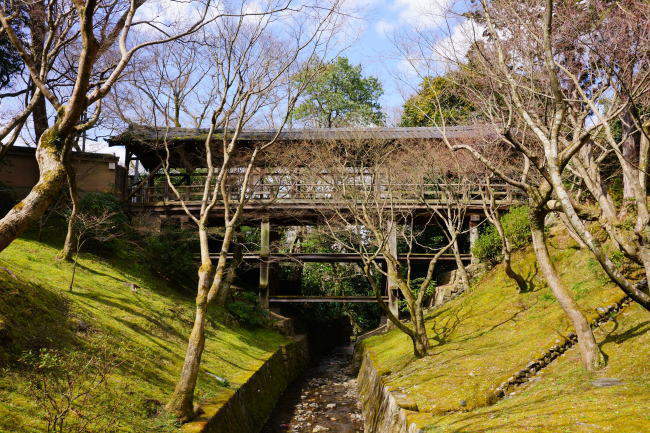 偃月橋(えんげつきょう) 三の橋川に架かる桟瓦葺きの木造橋廊で、通天橋、臥雲橋とともに東福寺三名橋と呼ばれており、慶長8年(1603年)に再建されたもので、日本百名橋のひとつに選定されていて、国の重要文化財に指定されています。 |