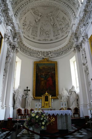 翼廊には聖マグダラのマリア(右側)と、右手に鉗子(かんし)を持った聖アポロニア(左側)の彫像があります。 聖マグダラのマリアは、「罪深い女」として知られていますが、新約聖書の福音書に登場する人物で、キリストの死と復活を見届けた証人とされています。 聖アポロニアは、ローマ帝政時代のアレクサンドリアで殉死したキリスト教徒で、言い伝えによると拷問により、歯をすべて引き抜かれたか、粉々に砕かれたとなっており、歯科学や歯痛を患う者、歯に関する問題全ての守護聖人となっています。 |